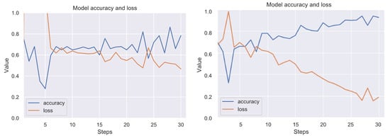 Exemplary learning effect before (left side) and after using our technique (right side). Results for the RIYADH dataset. Class ok (without artifacts) vs. class er (with strong artifacts). The line graphs show accuracy (blue) and loss (orange) for 15 epochs (30 steps from batch). Although the image dataset is relatively small for the convolutional neural network (CNN), a good trend in increasing accuracy while minimizing loss can be observed.