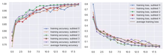 Summary of average results for 20 iterations. Class 0 vs. I. Model: the LeNet model from Figure 5 was applied. Cross-validation 5. Accuracy for 20 iterations of neural network training and corresponding cross-entropy loss.