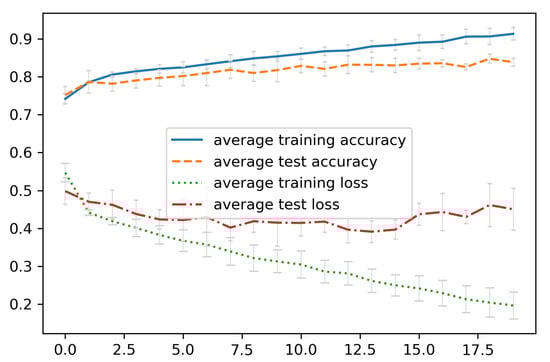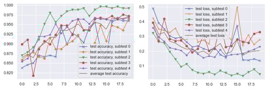 Summary of average results for 20 iterations. Class 0 vs. All. Model: the LeNet model from Figure 5 was applied. Cross-validation 5. Accuracy for 20 iterations of neural network training and corresponding cross-entropy loss.