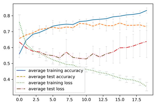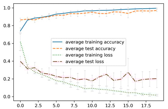 Summary of average results for 20 iterations. Class 0 vs. II. Model: the LeNet model from Figure 5 was applied. Cross-validation 5. Accuracy for 20 iterations of neural network training and corresponding cross-entropy loss.