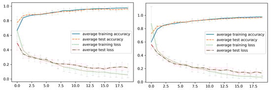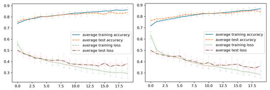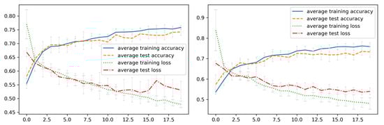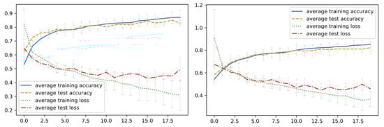 Left image: single dropout. Right image: double dropout. Summary of average results for 20 iterations. Class 0 vs. II. Single dropout. Model: the LeNet model from Figure 5 was applied. Cross-validation 5. Accuracy for 20 iterations of neural network training and corresponding cross-entropy loss.