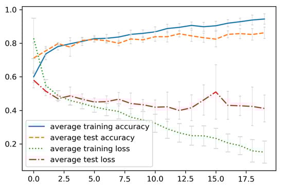 First of all, we show demonstrably very detailed results for variant class 0 vs. class 3. We present the accuracy of classification and entropy loss of a given variant—see, e.g., Figure 8. Then, we present what the classification of the validation test systems looked like in a given iteration and subtest—see, e.g., Figure 9. We then show the combined average results by adding the standard deviation in the form of vertical lines in individual epochs—see, e.g., Figure 10 and Figure 11. The standard deviation was calculated from individual subtests of the MCCV method.
