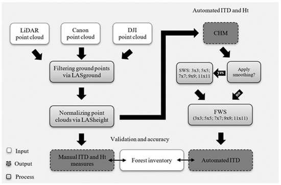 Using the rLiDAR package [38] for the R programming language [39], the CHM was processed by a mean smooth filter testing with five smoothing window sizes (SWS) of 3 × 3, 5 × 5, 7 × 7, 9 × 9, and 11 × 11 pixels. In the rLiDAR package the FindTreesCHM function was used to automate ITD. This function offers an option to search for treetops in the CHM via moving window with a Fixed Window Size (FWS). Similar to the SWS test, we tested five search window sizes (FWS) of 3 × 3, 5 × 5, 7 × 7, 9 × 9, and 11 × 11 pixels. The automated ITD was performed using a 2-m height threshold (i.e., any detected tree less than 2 m height was omitted). Figure 2 summarizes the workflow of the study methodology.