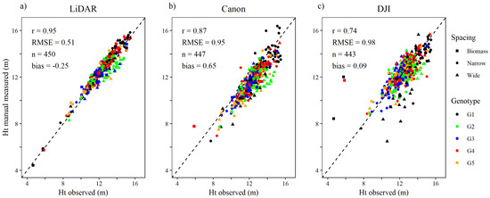 Relationship between individual tree height (Ht) observed by timber cruise and tree height manually measured in the (a) lidar, (b) DSLR (Canon) and (c) wide-angle (DJI) sensors’ respective point clouds.
