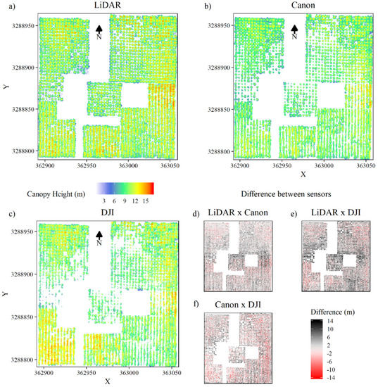 Canopy height models (a–c) and canopy height model (CHM) differences between sensors (d–f).