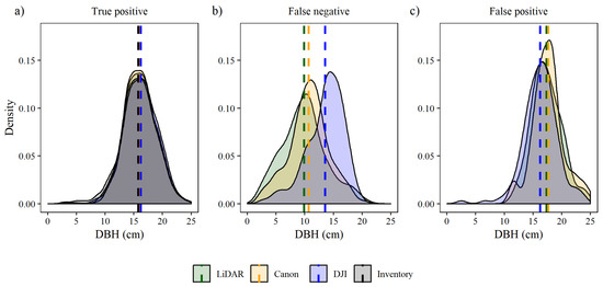 To further analyze under which conditions each dataset correctly or incorrectly identified trees, kernel density plots for TP, FN, and FP were created for each sensor with tree DBH as the abscissa. The bandwidth for the kernel density plots was chosen according to Silverman’s rule of thumb [41].