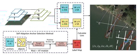 The main structure of our detector and training process. (1) A in this figure means there are A rotation anchors in each feature point and K means there are K categories needing to be predicted; (2) The values of points in label map mean which target this anchor matches; (3) The positive anchor set is selected by a fixed threshold of horizontal (referred to as ), which is a rough selection; (4) AT module calculates the threshold based on the distribution of the rotating (referred to as ) and the final positive anchors are selected by this threshold in the subtle selection process; (5) are the deviations between anchors and objects, which need to be decoded.