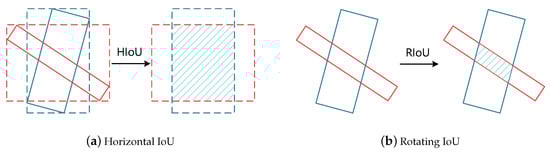 Our main network architecture uses ResNet architecture with a Feature Pyramid Network backbone to extract rich, multi-scale, directional feature information from images. As shown in Figure 2, ResNet generates and , which denote to of feature pyramid network. Furthermore, to are the feature levels for prediction, whose feature map size are the down-sampling ratio of times of input image. In this paper, all input images are resized into 800 × 800. There are two subnetworks in charge of predicting category and bounding box for each , where . The final feature map of category prediction branch predicts K values representing K categories for each anchor in each feature point where there are A anchors in each feature point. The predicting values are transformed into the probability of each category by function. In the bounding box predicting branch, the final feature map predicts a tuple of representing the deviation relative to the anchor, which needs to be decode into . In addition, two subnetworks share the same parameter weights of all feature levels, which greatly reduces computation. The network architecture is almost the same as RetinaNet [], except using rotating anchors and predicting a tuple of 5 values in the output feature map of the bounding box predicting branch. The details of implementation for those differences are represented in Section 2.3.4 and Section 2.3.6.