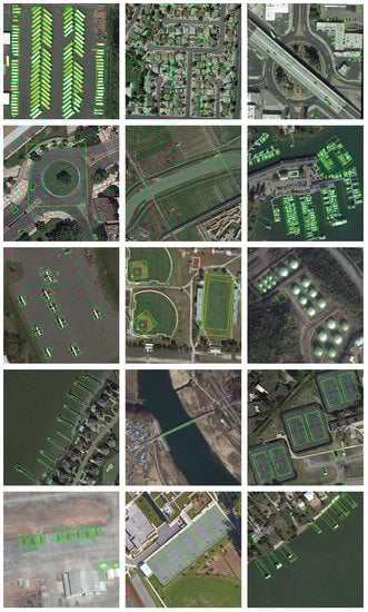 S-Det is compared with other rotating detectors in Table 1 under the evaluation method of . In the inference process, we divide test images into 600 with the overlap of 200, referring to R3Det []. S-Det has better performance than most detectors in Table 1, including one-stage detectors [,,,,,,] and two-stage detectors [,,,,]. On Ship, Small Vehicle(SV), Large Vehicle(LV), Basketball Court(BC), Storage Tank(ST), Swimming Pool(SP), our method achieves the best performance. For categories with large aspect ratios, S-Det has a distinct advantage compared with other detectors where the self-adaptive anchor selection method improves the anchor selection process. The visualizations of predictions are shown in Figure 6.
