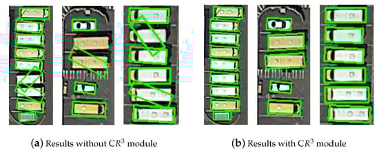 C module proposed in Section 2.3.4 solves the problem of inaccurate regression. As shown in Table 2, C module has a positive influence. In the benchmark of S-Det without C module, there is a total 0.39% increase if C module is applied to S-Det. For those objects with large aspect ratios, there is an obvious increase, especially for , , , and . What is more, there are 0.55% increase for , 0.3% increase for , and 0.5% increase for . Just from the view of , C module may not have a big advantage while the increase of AP is not obvious. For evaluating if a target is detected correctly, the rotating threshold is set to 0.5 in Evaluation-Server []. The object is considered to be detected correctly if the rotating between the predicted bounding box and the ground-truth box is greater than the threshold. As shown in Figure 8, the bounding box of S-Det with C module regress better than the bounding box of S-Det without C module. Due to the rotating threshold of 0.5, most predicted boxes are judged as correct while there is a little deviation in the regression of bounding box, such as results in Figure 8. Whether regressing precisely has a greater influence on objects with larger aspect ratios().