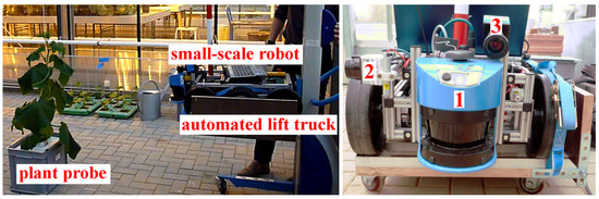 Figure 1. (Left): MSS on the vertical lift acquiring a plant probe. (Right): Front view of the MSS senors: (1) 2D laser scanner of type SICK LMS 500-20000 PRO-HR, (2) 2D laser scanner of type Hokuyo URG-04LX, (3) digital camera of type The Imaging Source DFK 41.