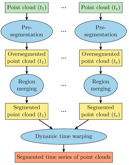 In this contribution, the sum of the Euclidean distances between two sequences is used as cost function c D T W . Given that exactly one matching partner to each template exists, the segment causing the smallest warping cost is the desired correspondence. However, because of the occasional oversegmentations, this assumption cannot be taken for granted. For this reason, the warping costs of combined segments are computed as well, while each segmented point cloud is alternately interpreted as a template. The result of these computations is a list of potential correspondences and the respective costs. The corresponding segments are greedily chosen from this list, starting with the combination leading to the overall smallest warping costs. In some special situations, the number of leaves may not be the same in different epochs (e.g., due to newly growing leaves or leaves that fall off the plant.) The greedy search allows an adequate handling of such situations—by linking combinations in increasing order of their warping costs, segments with no correspondence are left over and, hence, are not linked to another segment. For further details see Reference [27].