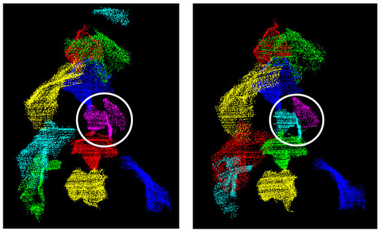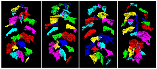 Figure 10. Result of the spatial segmentation of plant p 1 _ e (the same colours in different point clouds do not have a meaning).