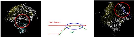Figure 13. (Left): A data gap impedes the merging of the yellow- and green-coloured segments. The white class consists of points which are not allocated to any leaf. (Middle): Horizontal laser beams fail to acquire horizontal oriented leafs. (Right): Oversegmentation caused by the horizontal laser beam.