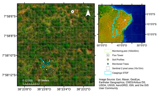 The study site (Figure 1) is located in central-northern part of the Brazilian state of Pernambuco, in the municipality of Serra Talhada (758’12” S, 3823’06” W, 455 m a.s.l.). The soils are predominantly Aridisols Argid and Entisols orthents [36]. The area has a relatively smooth relief and comprises various xerophilous vegetation types [37]. The local climate is Bsh (arid-steppe-hot arid) according to the Köppen system in a transition region to the Aw (winter dry season) [38,39,40], with a mean annual rainfall of 680 mm yr and a mean temperature of 23.8 C [40]. The experimental site includes a 50 × 100 m monitoring plot (Figure 1) which is part of the Nordeste project plot network [41], and a 10 m tall eddy covariance (EC) flux tower (site ID BR-CST in AmeriFlux network; 7.9682 S, 38.3842 E) located 200 m away from the monitoring plot.