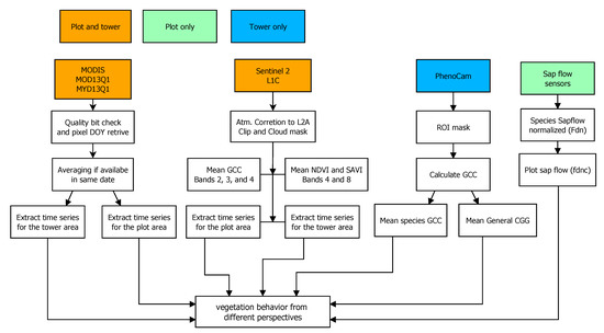 The experimental design is shown in the flowchart (Figure 2). In terms of ground data, the experimental strategy consists in: (i) measuring the sap flux density (F) on individual tree species found within the monitoring plot and normalizing it among the sampled species (F); (ii) upscaling the normalized flux density (F) to the level of the plot (or community; F); (iii) comparing the F with the soil water availability. The purpose of these measurements was to evaluate the main drivers affecting the physiological response of Caatinga trees (i.e., the plant-water availability and VPD). To test the relationship between plant physiology patterns (sap flow density) and leaf phenology, we used VIs obtained from different sources. Besides being used as a proxy of leaf phenology, VIs from different sources were also evaluated in terms of their ability to represent certain physiological process, such as intra-annual variability of sap flow.