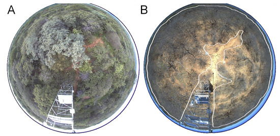Hemispherical image used for the proximal remote sensing phenological analyses at the study site, PE-Brazil; (A) In the rainy season day of year (DOY) 107, 2018. (B) In the dry season DOY 256, 2018; the area selected in white represents the entire vegetation sampled as the region of interest (ROI) of the community for the extraction of phenological indices.