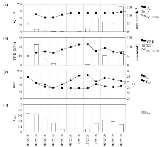 The inverse relationship between VPD and ET is also partially caused by the fact that, during the dry season, all trees shed their leaves and water uptake reduces to near-zero, despite the increase in VPD. Furthermore, during leaf-on periods with low atmospheric humidity, it is the strong negative dependence of stomatal opening on VPD that counteracts the concurrent increase in driving force, as mentioned in the introduction. Although the VPD values tend to be lower during the rainy season, thereby reducing potential transpiration, ET is high due to an increased water availability and related presence of leaves. Moreover, there is a strong relationship between VPD and T (Figure 5c), given the temperature depends on the saturated vapour pressure as calculated by Teten’s formula [47]; around 57% of the VPD variation is caused by the variation in T.
