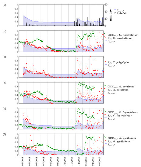 (a) Rainfall (mm day) and soil water profile relative saturation (, dimensionless); and normalized near surface species GCC (GCC, dimensionless), and species averaged sap flow density (F, dimensionless), together with for (b) C. nordestinum and ; (c) S. polyphylla; (d) A. colubrina; (e) C. leptophloeos; (f) A. pyrifolium.