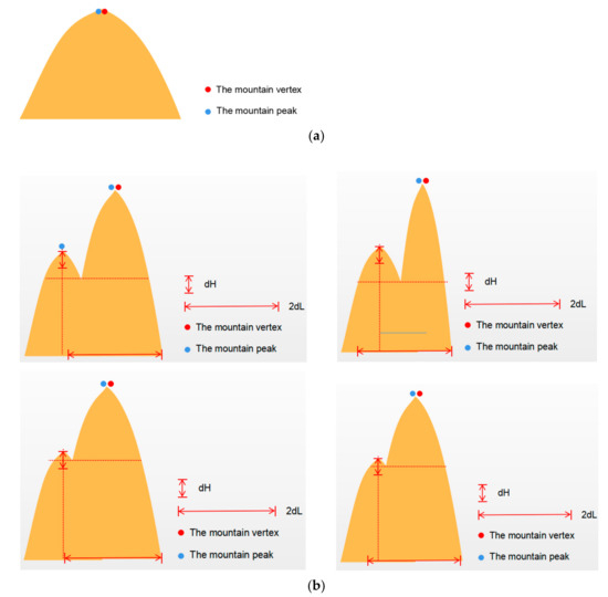 The difference between mountain vertex and the mountain peak. (a) A mountain with a single peak (the mountain vertex coincides with the mountain peak); (b) A mountain with two or multiple peaks (the mountain vertex is not always the same as the mountain peaks).
