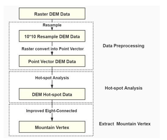 The remainder of this paper is organized as follows: Section 2 introduces the traditional mountain vertex Extraction methods and explains the Hotspot Analysis Clustering and Improved Eight-Connected Extraction Algorithms used in our proposed approach. Experiments and the discussion of results are provided in Section 3. The conclusions are presented in Section 4.