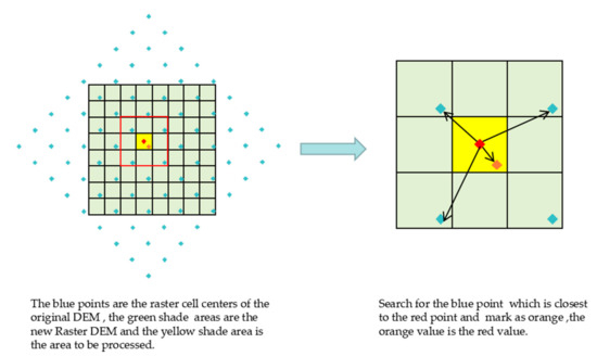 The pixel size is set after resampling to 10 × 10. The original raster DEM is rotated by 45° and placed on top of the output resampled raster DEM. The nearest neighbor interpolation algorithm can be used to calculate the raster value for each resampling raster DEM. The cell value size in the new raster DEM is determined by the value of the nearest raster cell in the original DEM image. As shown in Figure 3, the blue points are the center of the raster cell of the original DEM, the green shaded area is the new raster DEM, the yellow shaded area is the area to be processed, and the red points are the cell centers of the new raster DEM. For each cell, the blue dots closest to the red dots are identified and marked in orange. The value of the orange point is used as the value of the red point.