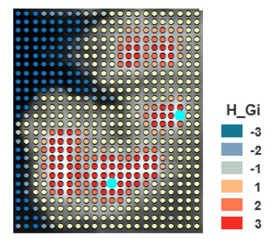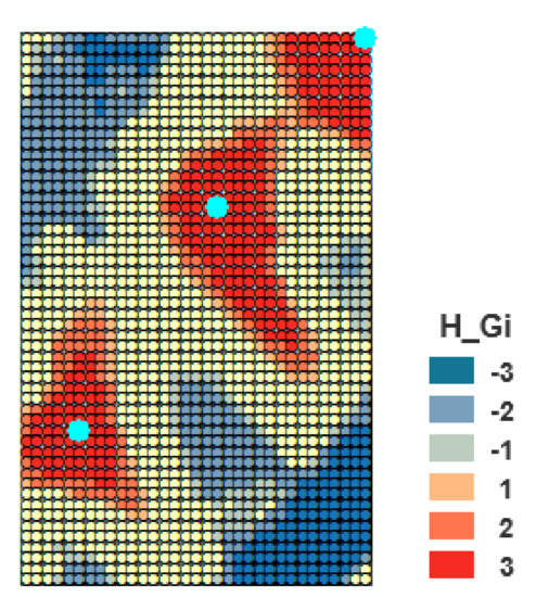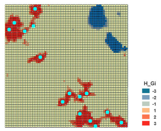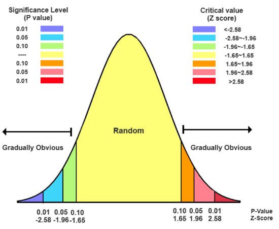 In analyzing the spatial correlation, the p-value represents the observed spatial pattern’s probability being created by a random process. When the p-value is small and less than a certain threshold, this indicates that the spatial distribution is non-random and follows a particular pattern [42]. The Z-score is a multiple of the standard deviation that mainly reflects the degree of dispersion of the dataset.