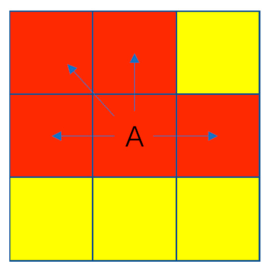 The Improved Eight-Connected Extraction algorithm mainly improves the eight-direction into four-way optimization. First, the attribute value in four directions (left, upper left, upper, and right) is evaluated on whether it is the desired attribute and assessed for its connectivity. If the answer is yes, the cell is marked. As shown in Figure 5, since the attribute values on the cells to the left, upper left, upper, and right sides of point A are consistent, the cell is marked accordingly.