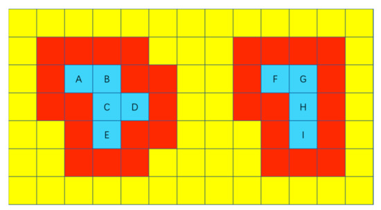 The Improved Eight-Connected Algorithm is used to mark the points with the H_Gi attribute value of 3 (Z-score > +2.58, p-value < 0.01) in the DEM Hotspot Analysis Image (shown in red in Figure 7). The marked points are represented as blue cells in the image. After the marking procedure is completed, the image is scanned from left to right and top to bottom. The points are then grouped according to whether they are adjacent to other marked points. As shown in the figure, points A, B, C, D, and E are grouped together, while points F, G, H, and I are clustered in another group. The cell with the highest elevation attribute in each group is then considered as the candidate mountain vertex.