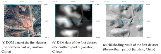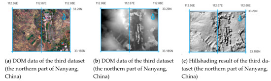 Experimental results for Dataset 1: (a) DOM data for Dataset 1 (Jianzhou); (b) DEM data for Dataset 1 (Jianzhou); (c) Hillshading results for Dataset 1 (Jianzhou).