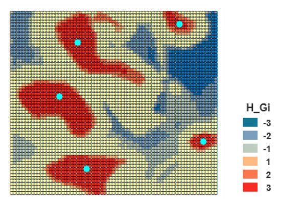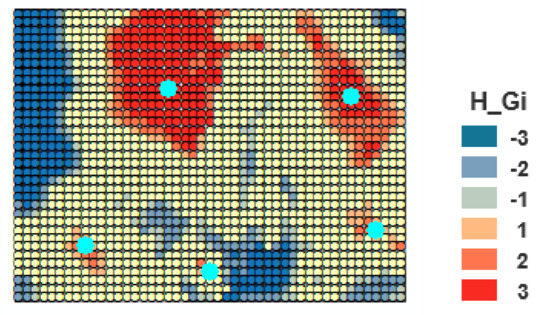 The attribute data of the DEM Hotspot Analysis Image was then exported. Using different p-value, Z-score, and confidence levels, numerical values (i.e., −3, −2, −1, 1, 2, 3 to 6) were assigned to the different situations. Table 2 summarizes the correspondence between the Z-score, p-value, confidence levels, and attribute H_Gi.