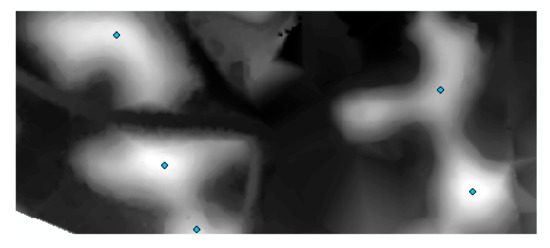 Dataset 7 was also used to compare the different methods of mountain vertex extraction. The distribution graphs for each mountain extraction method are shown in the following figures. Figure 33 shows the distribution map extracted using the reference method. Figure 34a shows the distribution map using the Contour Line Extraction procedure, Figure 34b using the Neighborhood Analysis Method, and Figure 34c using the Contour Line and Neighborhood Analysis Overlay Method. The distribution map of mountain vertices extracted using our proposed approach is provided in Figure 35.