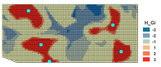 - Peeters, A.; Zude, M.; Käthner, J.; Ünlü, M.; Kanber, R.; Hetzroni, A.; Gebbers, R.; Ben-Gal, A. Getis–Ord’s hot-and cold-spot statistics as a basis for multivariate spatial clustering of orchard tree data. Comput. Electron. Agric. 2015, 111, 140–150. [Google Scholar] [CrossRef]
