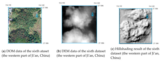 The first dataset consists of a raster DEM of Jianzhou New Town, Sichuan Province, China (longitude: 104.10°E–104.16°E, latitude: 30.60°N~30.66°N). As shown in Figure 8, the image has a 1 m spatial resolution, uses the CGCS2000 coordinate system, and has 610 rows and 690 columns. The terrain is mainly mountainous, with an average altitude of 429~483 m and a height difference of about 54 m. Figure 8 shows the data and results for Dataset 1: (a) is the Digital Orthophoto Map (DOM), (b) is the Digital Elevation Model (DEM), and (c) is the hillshading results.