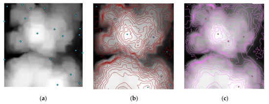 The Contour Line Method extracts mountain vertices [39] by generating the contour lines from Raster DEM and uses the change range of the elevation variance to evaluate the vertex’s influence range. It then finds the innermost contour line in the influence range and uses the interpolation algorithm to obtain the mountain vertex value. This method is affected by elevation and contour height difference threshold and generally yields low accuracy results of mountain vertices.