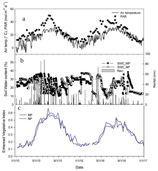 Seasonal dynamics of (a) air temperature, photosynthetically active radiation (PAR), (b) soil water content, rainfall, and (c) Moderate Resolution Spectroradiometer (MODIS)-derived enhanced vegetation index for the study sites in 2015 and 2016.