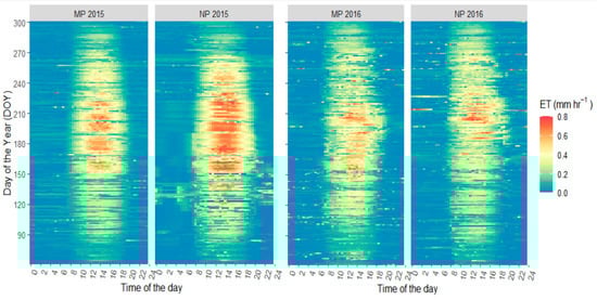 Diurnal courses of ET and changes in ET rates (half hourly) for MP and NP across the 2015 and 2016 growing seasons are presented in Figure 3. Typical diurnal trends (average for all days in a month) in both pastures across the growing seasons are compared in Figure 4. Higher half-hourly ET rates (dark red color) were observed between 10 am and 6 pm of each day. There were large differences in ET at half-hourly and daily scales between sites and years. The patterns of ET at the 8-day time step are presented in Figure 5. During the growing season, daily ET (8-day average) in MP was in the range of 0.5 to 6.4 mm d−1 in 2015 and 0.6 to 5.0 mm d−1 in 2016.