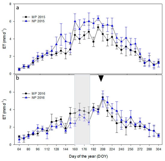 Patterns of 8-day average daily evapotranspiration (ET) in managed pasture (MP) and native pasture (NP) during the 2015 (a) and 2016 (b) growing seasons. Bars represent standard errors of the means. The shaded region in b represents a case of 30-day grazing window in both pastures, and the black inverted triangle in b represents the timing for hay in MP.