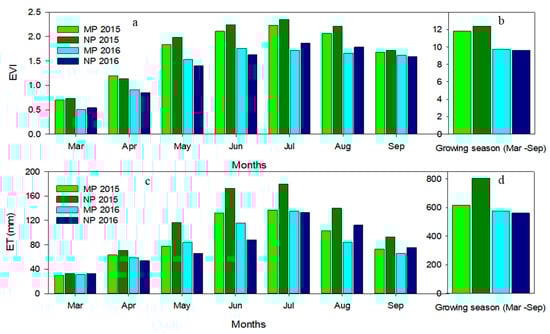 Daily ET for NP was in the range of 0.5 to 4.6 mm d−1 in 2015 and 0.9 to 4.8 mm d−1 in 2016. Generally, in both years, with the growth of vegetation, the ET rates started to increase and reached a maximum during June–July before declining during the late growing season in both pastures. However, the magnitude and timing of higher ET rates varied between years and pasture types depending upon weather conditions and plant growth. Good rainfall distribution in 2015 contributed to higher ET rates from mid-April to September in NP than MP (dark red shades in Figure 3. In 2016, ET rates followed the growth patterns of vegetation. The earlier green-up in MP showed higher ET rates in MP during the early growing season, while this pattern was vice versa during the late growing season. In both years, monthly sums of ET followed the pattern of EVI sums (Figure 6). However, the magnitudes of ET were dependent on the rainfall conditions. The higher EVI values in 2015 in NP than MP corresponded with the highest seasonal ET values of 804 mm (63% of total annual rainfall). The total growing season ET for MP in 2015 was only 616 mm (48% of annual rainfall). The growing season ET totals in 2016 were similar between the two pastures, with 573 mm (90% of total annual rainfall) in MP and 561 mm (88% of total annual rainfall) in NP. However, the monthly sums of EVI and ET for these two pastures were different. The MP had both higher EVI and ET (monthly sums) in April–June, whereas the sums of EVI and ET in August and September were higher in NP.
