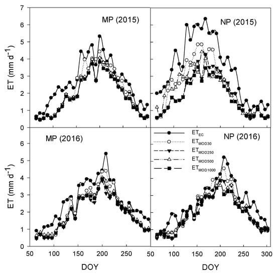 3.2. Comparison of MODIS ET (MODET30, ETMOD200, ETMOD500, and ETMOD1000) and ETEC at the Study Sites during 2015–2016