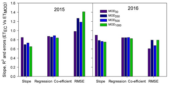 Performance of MOD ET (MODET30, ETMOD200, ETMOD500, and ETMOD1000) data at 30, 250, 500, and 1000 m spatial scales based on bias (slope), regression coefficients (R2), and root mean square error (RMSE) obtained from the linear regression against ET from eddy covariance (ETEC).