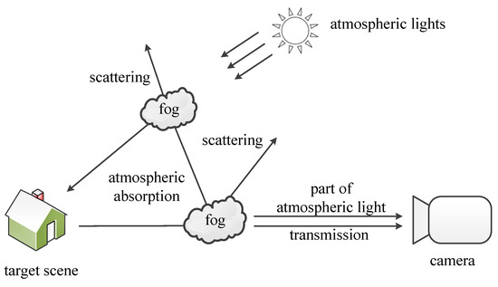 In computer vision and computer graphics, the haze imaging model generated according to the principles of the atmospheric scattering model is widely used, as shown in Figure 1, the physical model widely used to describe the formation of a haze image is as the following Equations (1)–(3):