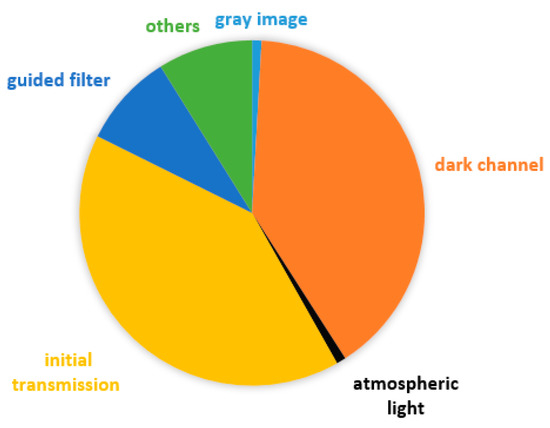 The most time-consuming parts are channel calculation and transmission calculation. The minimum filter is used to calculate the dark channel and initial transmission. The major process of the guided filter is the mean filter. So, the most time-consuming part is the minimum filter and the mean filter.