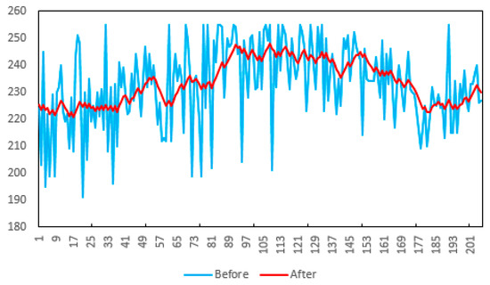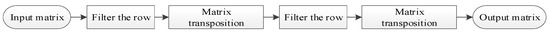 Data reusage can improve the mean filter greatly with row and column processing, separately. The method is shown in Figure 7. In this algorithm, the results of two adjacent positions with data are calculated repeatedly. Even if one-dimensional mean filtering needs to be calculated twice, the repeated data of two adjacent positions is only . In addition, we also use the integral image [29] to further reduce data reusage and accelerate the mean filtering.