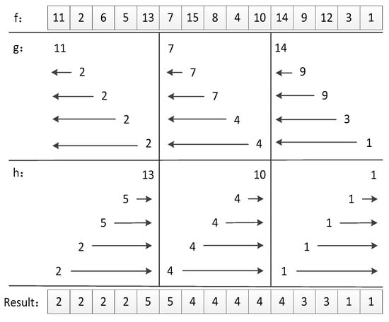 The local minimum/maximum fast filtering [16] proposed by Van Herk M is an algorithm that fully considers data multiplexing and has a computational complexity of only O(N). Recursive procedures (9) and (10) and operation (11) describe the whole algorithm: