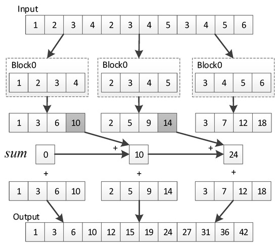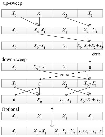 In 2010, Bilgic B et al. proposed an efficient parallel algorithm for real-time calculation of integral images [27]. This algorithm is based on the Parallel Prefix Sum (Scan), a very classic algorithm in the field of parallel computing. The specific process is shown in Figure 11.