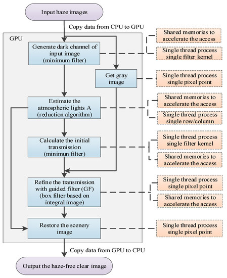 - Huang, F.; Lan, S.; Wu, J.; Liu, D. Haze removal in real-time based on CUDA. J. Comput. Appl. 2013, 33, 183–186. [Google Scholar]