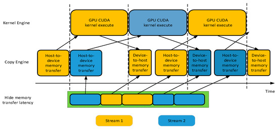We use two CUDA streams to hide the data transmission delay and reduce the GPU warm-up delay with asynchronous memory access. The accelerating result with asynchronous memory transfer is presented in next section. However, the transfer time of the first frame and the output time of the last frame are difficult conceal.