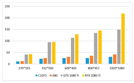 The experiments in this paper are evaluated on four GPU platforms: Tesla C2075, Tesla K80, GeForce GTX 1080 Ti, and GeForce RTX 2080 Ti. The detail parameters are shown in Table 1. GeForce RTX 2080 Ti uses the Turing architecture with a computing capability of 7.5. GeForce GTX 1080 Ti uses Pascal architecture with a computing capability of 6.1. The K80 uses dual-core GPUs based on Kepler architecture. The C2075 uses Fermi architecture. All GPU devices support memory allocation requirements for high-resolution image calculations. The deep optimized parallel haze removal algorithm combined with the appropriate allocation of memory can fully accelerate the performance of the kernel functions.