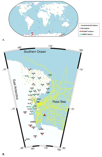 Within geodetic initiatives, about a hundred of CGNSS stations have been installed in Antarctica in the last two decades by several research initiatives coordinated by the scientific committee on Antarctic research (SCAR). Most of them belong to the International GNSS Service (IGS) network, and the observations contributed to the realization of the International Terrestrial Reference Frame (ITRF) at relevant epochs. Data processing of continuous and discontinuous Antarctic GNSS station contributed to the studies related to geodynamics [1,2], glaciology [3], crustal motions [4,5,6,7,8], and glacial isostatic adjustment (GIA) modelling [9,10,11,12,13]. Some of the mentioned studies adopted a set of extra-Antarctic CGNSS stations to define a reference frame for further investigations of surface motions and geodynamics within the Antarctic plate. For instance, Zanutta et al. [14] used a total of 235 GNSS stations worldwide (95 of which located in Antarctica, Figure 1A) for estimating the Eulerian pole of the Antarctic plate.